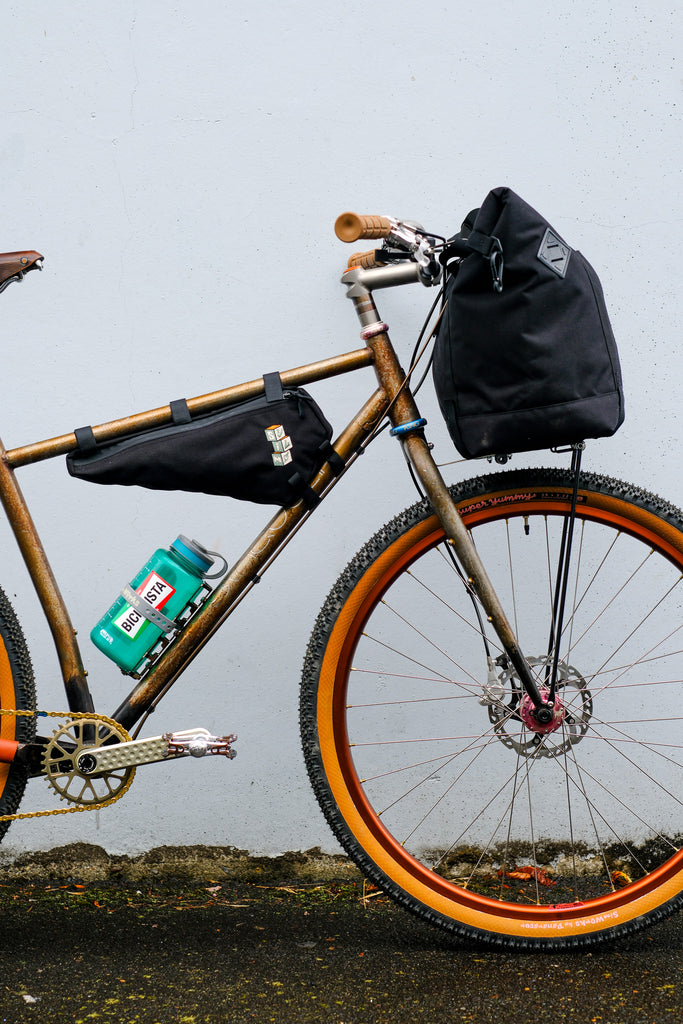 Our Origami Frame Bag boasts a sweet spot on size and utility for extended day rides, particularly when used in conjunction with a small seat pack like the Sim Loader 'EnRoute' bag. Occupying a reasonable space within the bike’s front triangle, the Origami attaches with broad velcro straps to the top tube and with a pair of cam buckles to the down tube- typically with the pack slid all the way forward to meet the intersection at the head tube. This positioning provides for both accessibility for the rider, while underway, as well as preventing the bag from wanting to walk out of position.