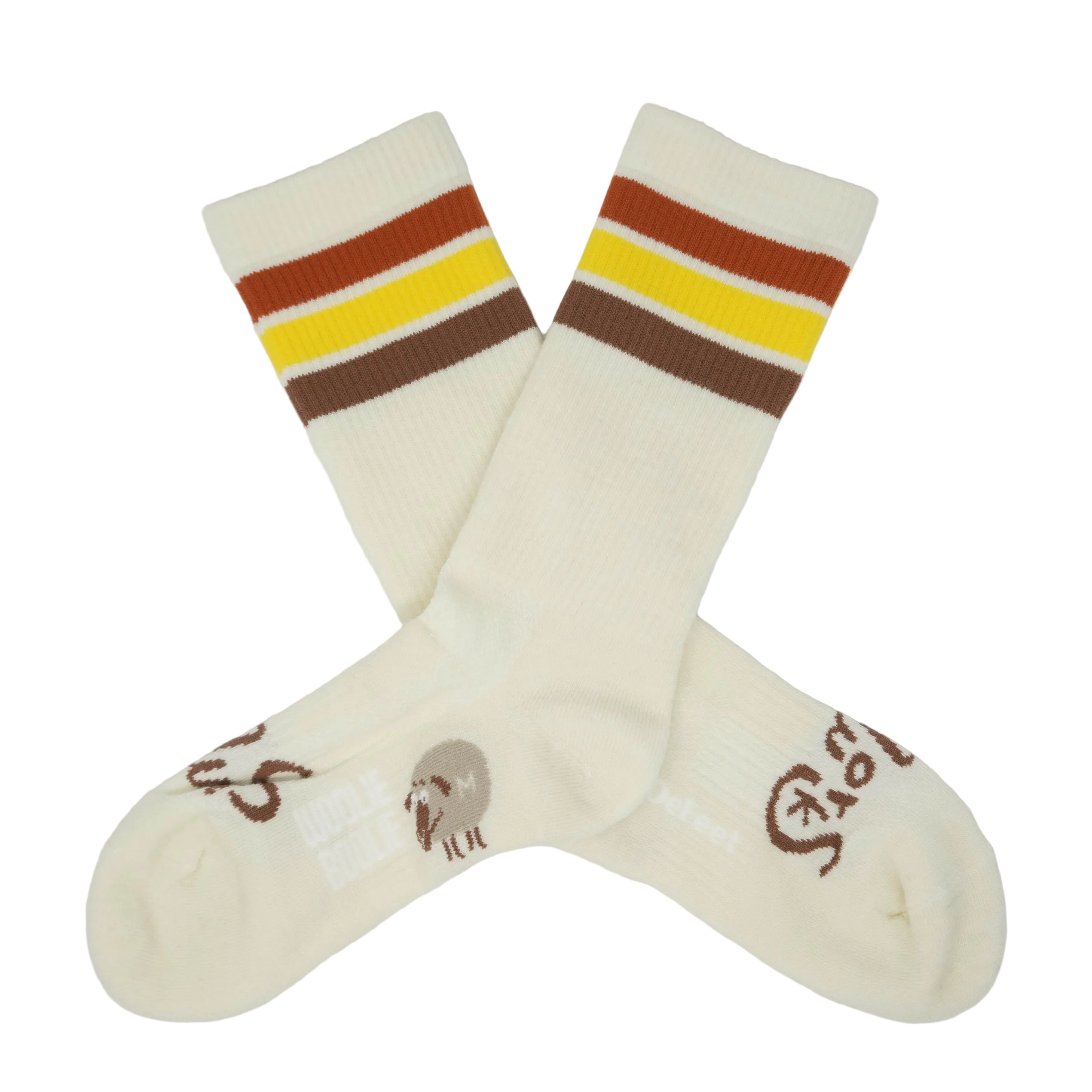 They're a great seasonal option for people just looking for a go-to casual sock that could certainly be worn on a bike ride, thrown on after a chilly day of surfing, or hanging out in camp or just strutting around town. Some quality merino blend socks are a great staple item that can always find a use in just about anyone's wardrobe. The colors are memorable- kind of leaning in to 70s retro vibes, they're a nice weight that we would probably characterize as 3-season. They're durable and made here in the States.